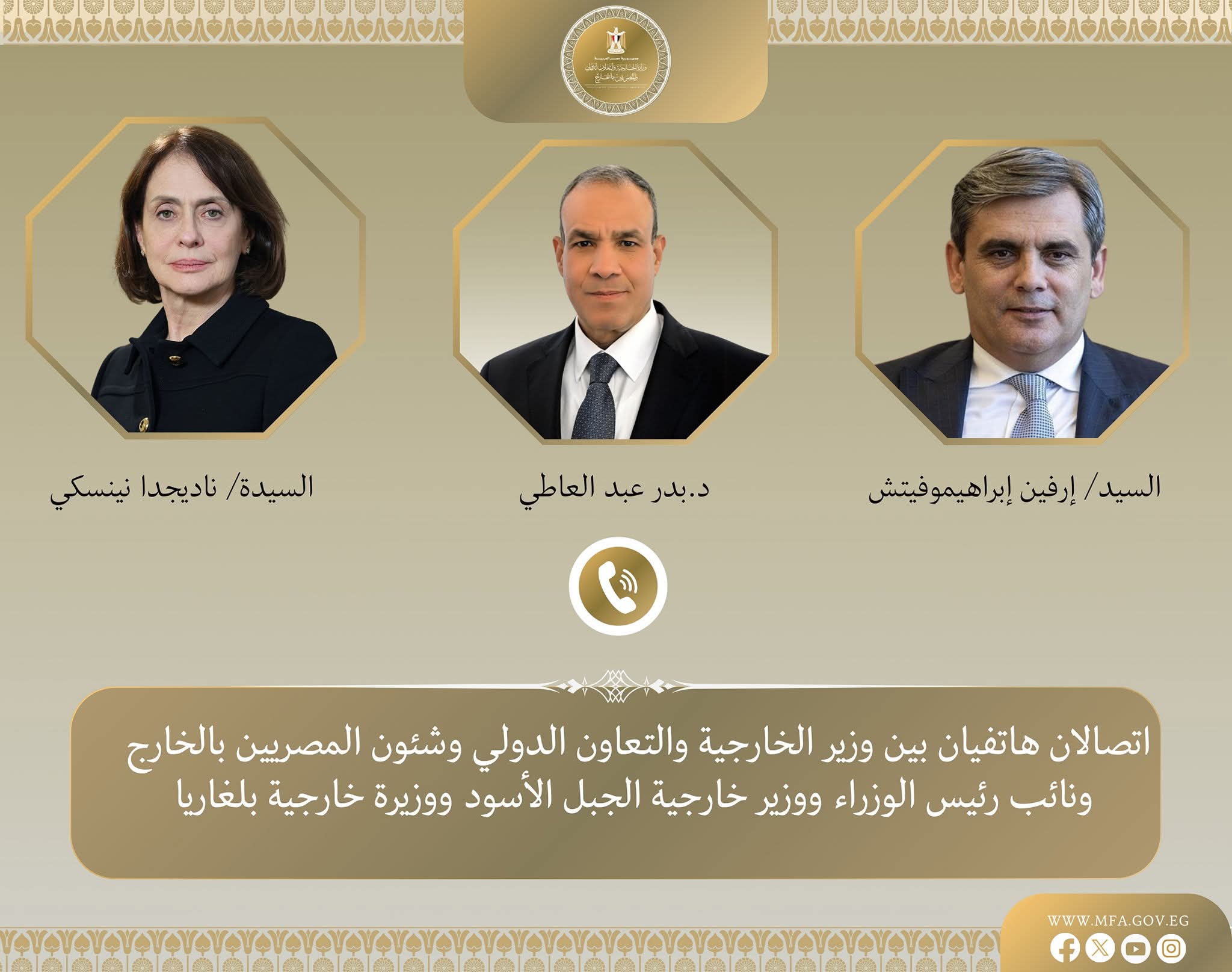 تلقى الدكتور بدر عبد العاطي وزير الخارجية والتعاون الدولي والمصريين بالخارج اتصالين هاتفيين من ناديجدا نينسكي، وزيرة الخارجية بجمهورية بلغاريا، وإرفين إبراهيموفيتش، نائب رئيس الوزراء ووزير خارجية الجبل الأسود يوم الاثنين ٢ مارس، وذلك لبحث تطورات التصعيد العسكري في المنطقة وتداعياته الوخيمة على الأمن والاستقرار الإقليميين.