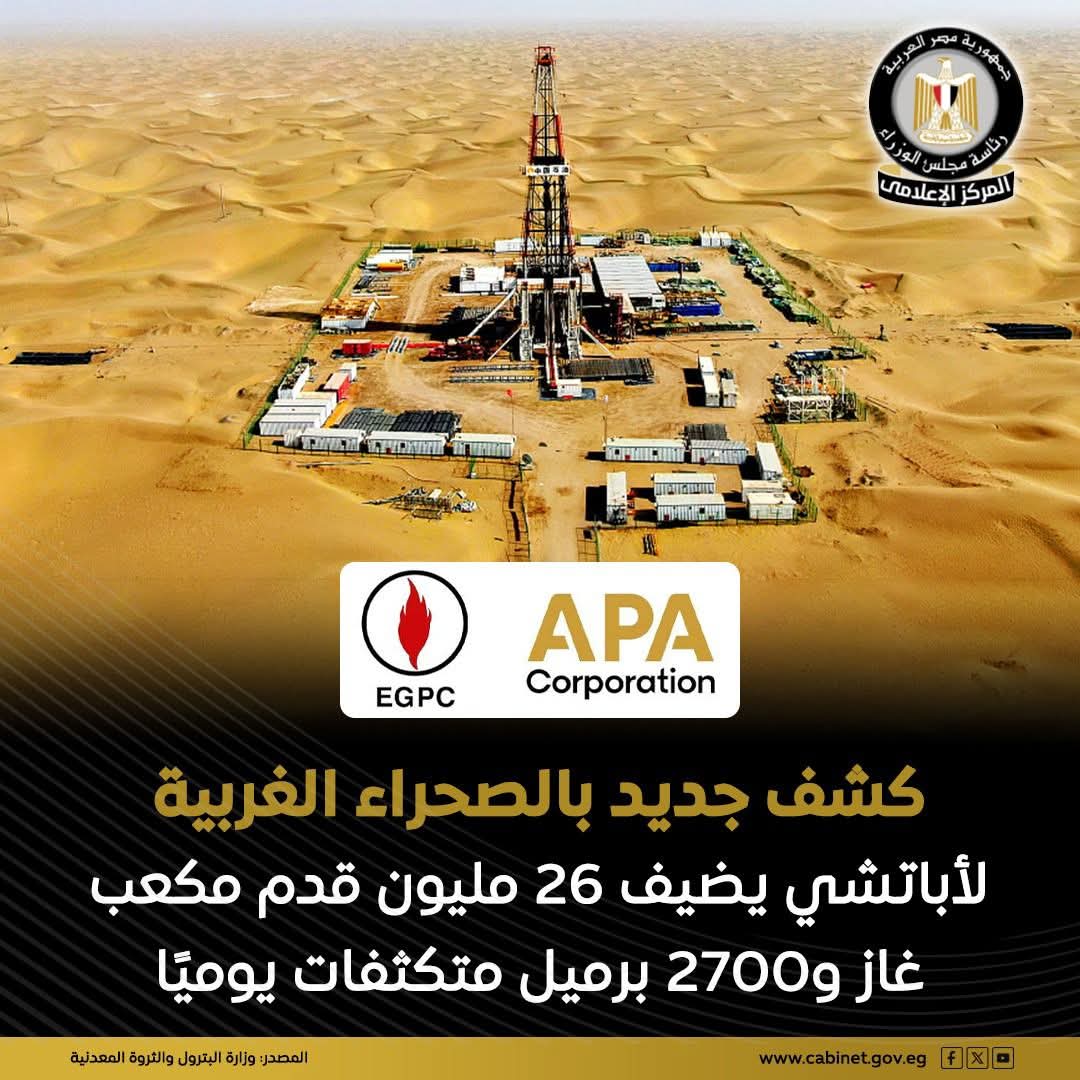 بدأت جهود تحفيز الاستثمار في قطاع الغاز الطبيعي تؤتي ثمارها، مع إعلان شركة أباتشي، بالتعاون مع الهيئة المصرية العامة للبترول، تحقيق كشف جديد في الصحراء الغربية، يضيف نحو 26 مليون قدم مكعب من الغاز يوميًا و2700 برميل من المتكثفات.