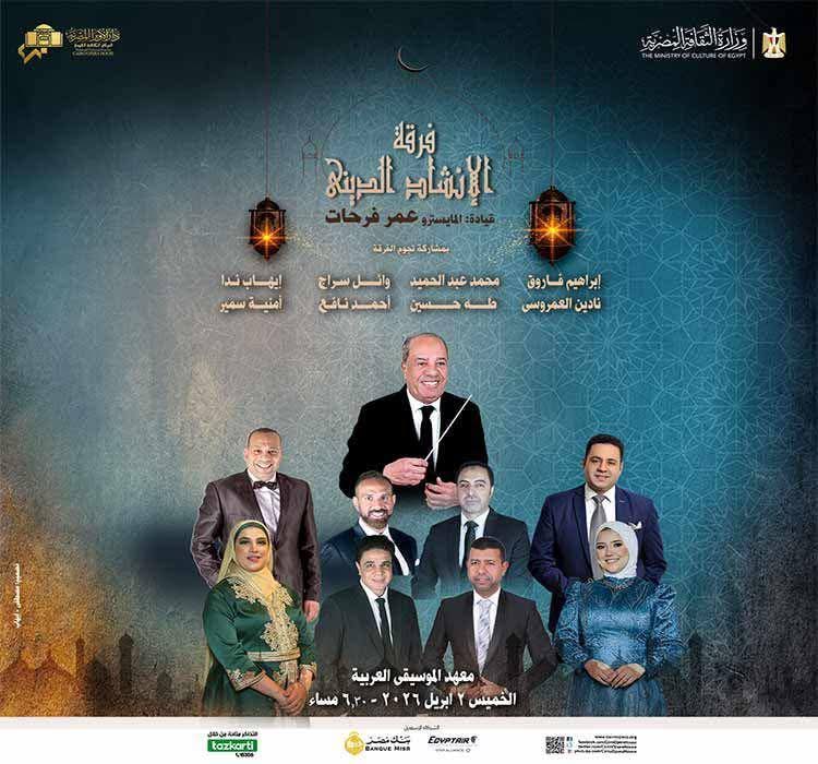 تنظم دار الأوبرا المصرية أمسية روحانية مميزة لفرقة الإنشاد الديني، بقيادة المايسترو عمر فرحات، وذلك في تمام السادسة والنصف مساء الخميس 2 أبريل على مسرح معهد الموسيقى العربية.