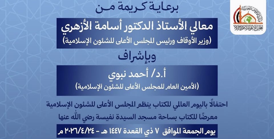 ينظم المجلس الأعلى للشئون الإسلامية معرضًا للكتاب داخل مسجد السيدة نفيسة، برعاية أسامة الأزهري وزير الأوقاف ورئيس المجلس، وبإشراف أحمد نبوي، وذلك يوم الجمعة 24 أبريل 2026، في إطار نشر الوعي الثقافي والديني
