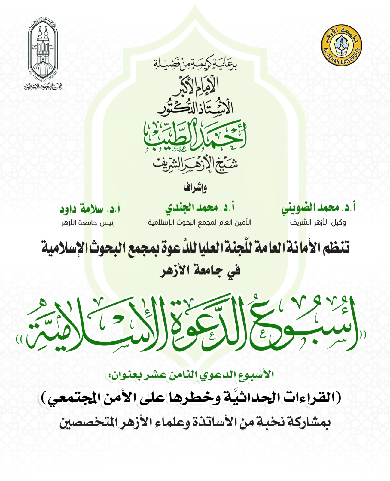 ينظِّم مجمع البحوث الإسلامية، الأحد المقبل، فعاليَّات الأسبوع الثامن عشر للدَّعوة الإسلاميَّة، الذي تعقده اللجنة العُليا لشئون الدَّعوة في جامعة الأزهر تحت عنوان: (القراءات الحداثيَّة وخطرها على الأمن المجتمعي)، برعايةٍ الدكتور أحمد الطيِّب، شيخ الأزهر الشريف، وإشراف الدكتور محمد الضويني، وكيل الأزهر، والدكتور محمد الجندي، الأمين العام لمجمع البحوث الإسلاميَّة.