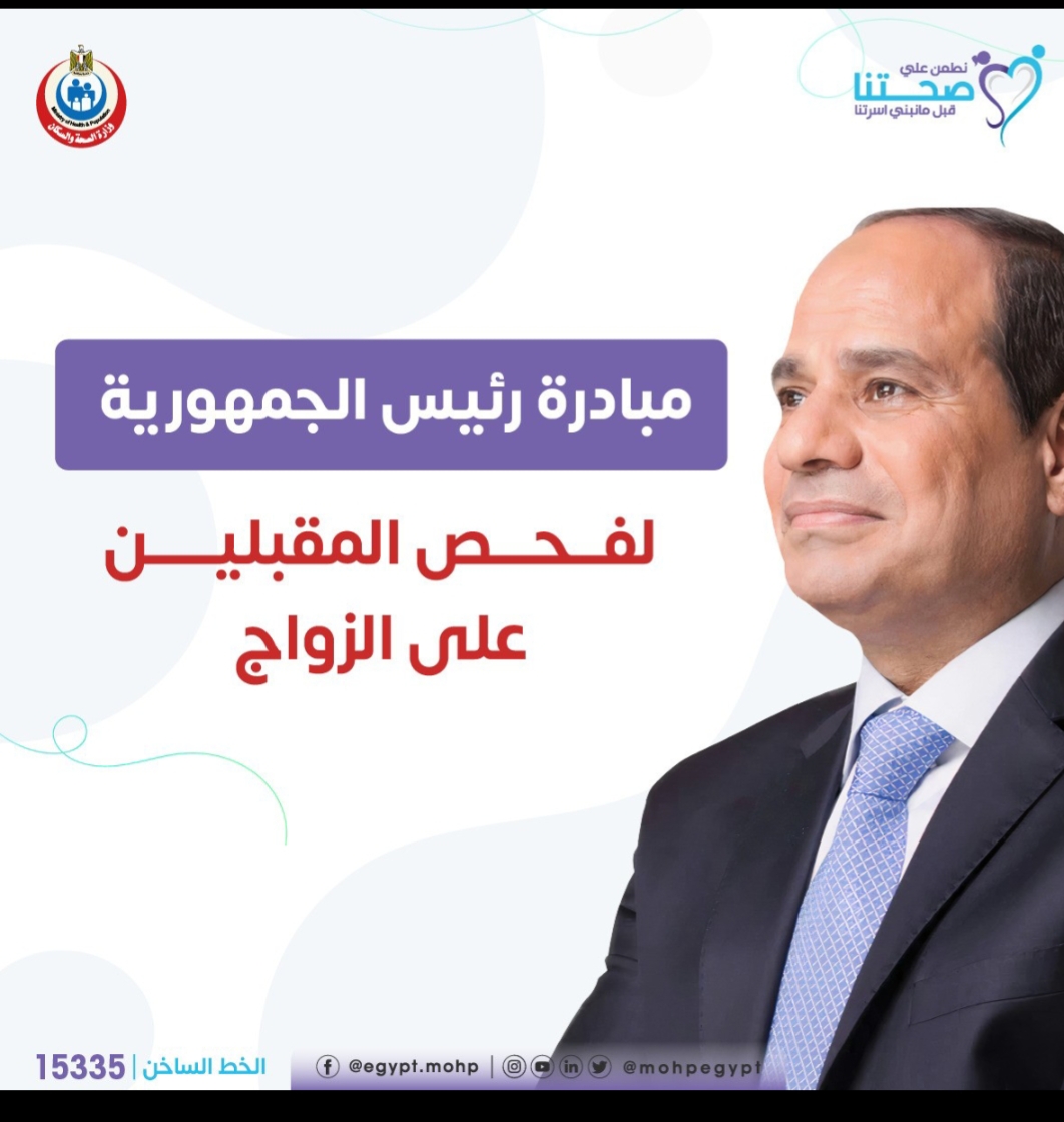 ودعت وزارة الصحة والسكان جميع المقبلين على الزواج إلى الاستفادة من مبادرة «فحص المقبلين على الزواج»، لما لها من دور مهم في ضمان صحة أفضل للأسرة المستقبلية، حيث تسهم في الكشف المبكر عن الأمراض المعدية والأمراض الوراثية، بما يعزز فرص تكوين أسرة سليمة وصحية، ويدعم جهود الدولة في الارتقاء بالصحة العامة للمجتمع.