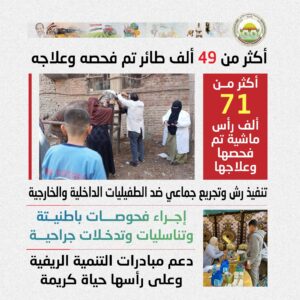 وأضاف أن القوافل شملت كذلك فحص وعلاج أكثر من 49 ألف طائر، ضمن جهود دعم قطاع الثروة الداجنة والتربية المنزلية، وتحسين معدلات الأمان الحيوي داخل القرى.